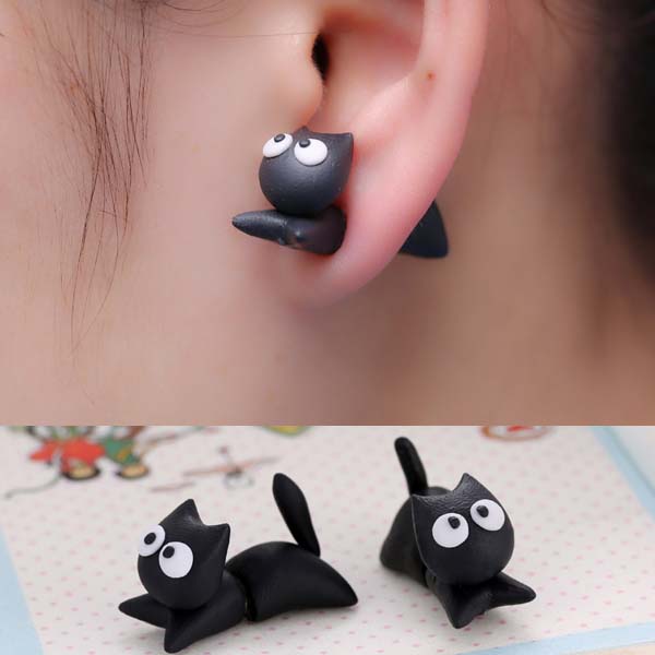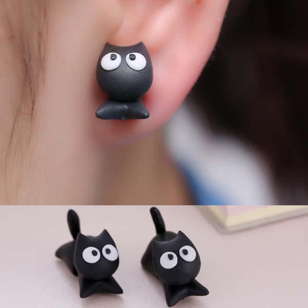 くりくりの可愛い目の黒猫をデザインした手作りピアス。